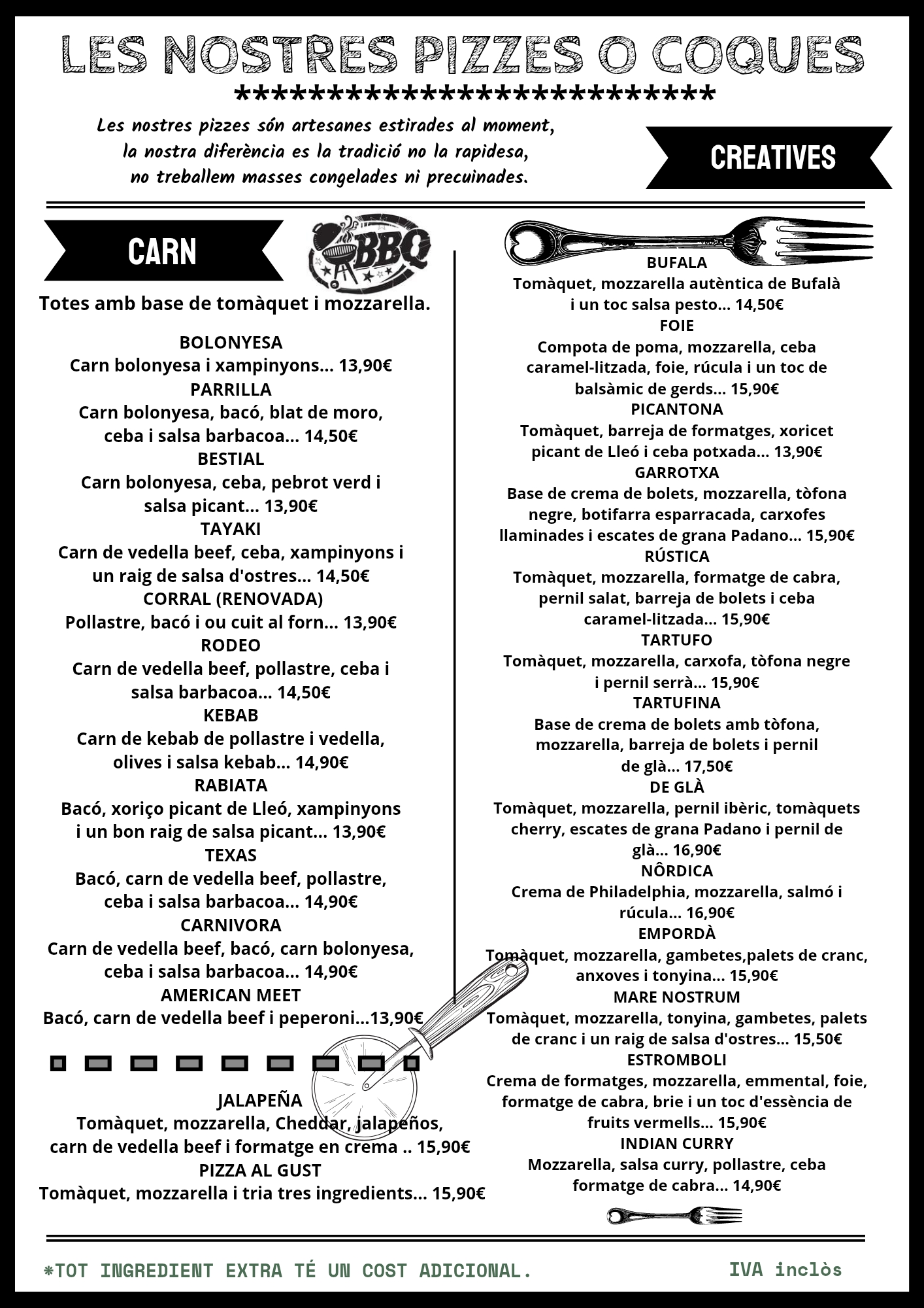 Dimecres, Dijous I diumenge vespre, pizzes per emportar 8€.